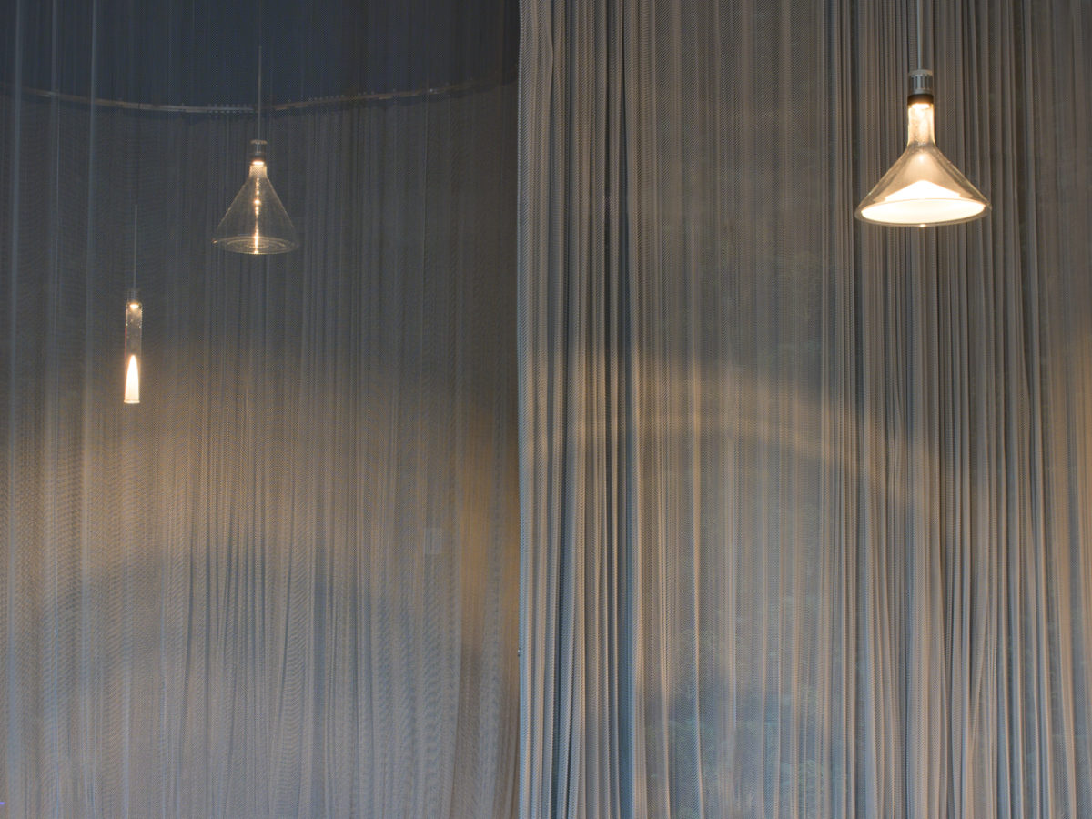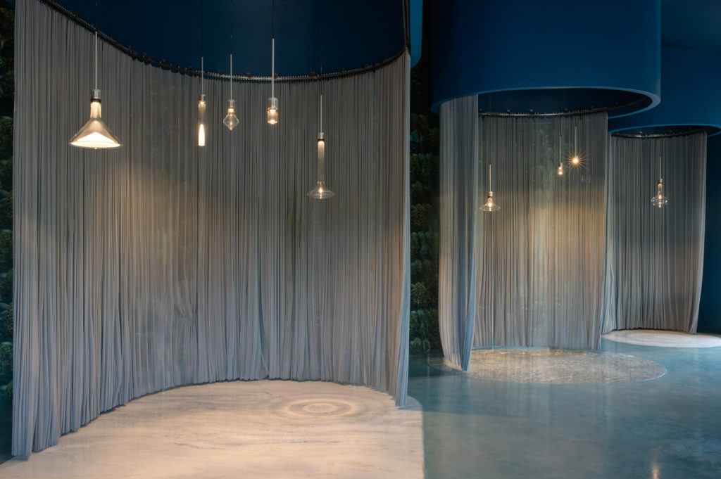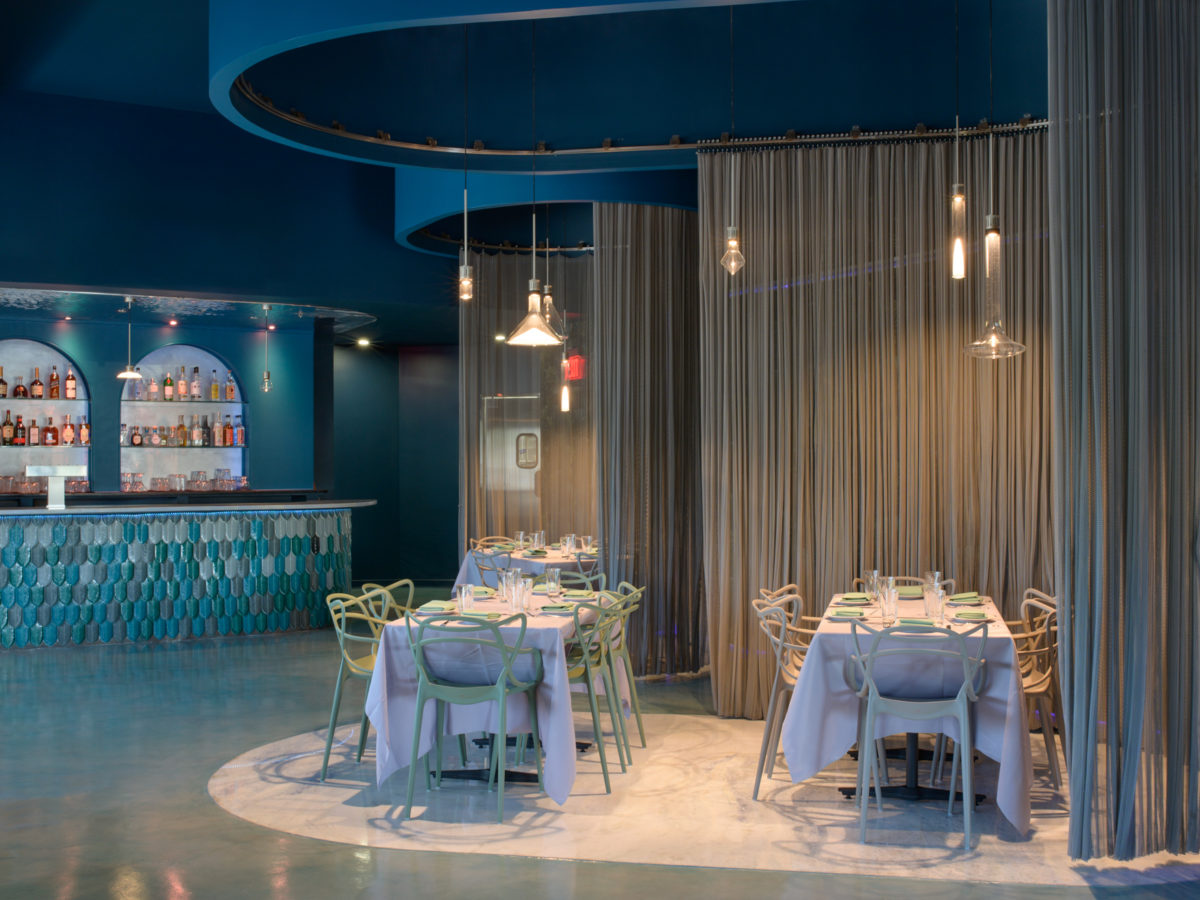 Il ristorante celebra la cucina fusion asiatica con un tocco elegante e contemporaneo. Progettato per ospitare momenti chic o allegri, il Tikka Charcoal Grill accoglie i suoi ospiti in uno spazio rilassante e intimo che ricorda un ecosistema sottomarino, con piastrelle italiane scintillanti, increspature d’acqua e luci Viabizzuno N55 che evocano le meduse.